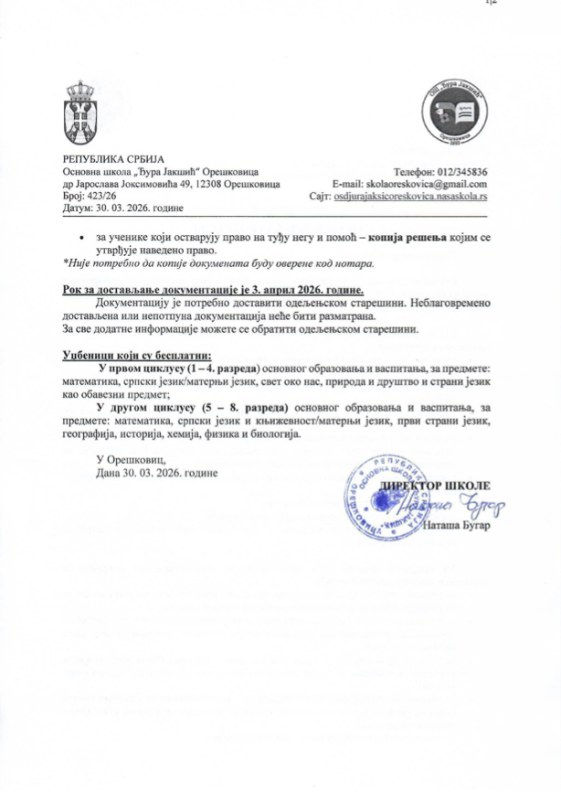 Обавештење за родитеље - право на бесплатне уџбенике. Преузми овде!